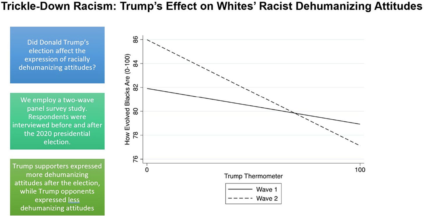 Reported hate crimes against Black people surged following Trump's 2016 election. While only a relatively small fraction of Americans committed these abhorrent actions, we show that Trump's victory had broader effects on the attitudes of the larger white public. Specifically, Trump altered the extent to which white survey respondents describe Black people in dehumanizing ways. We report findings from a two-wave national survey in which white respondents rated Black people on a dehumanizing attitudes scale before and after the 2016 presidential election. Trump supporters rated Black people as less "evolved” in the post-election wave than they rated Black people in the pre-election wave.